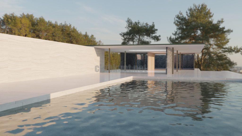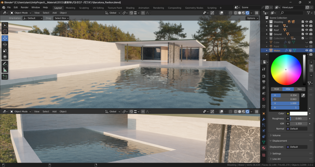 今回はプールに水を張るという想定で水面を作ってみます。波はデフォーマーのDisplace、水のマテリアルはGlass BSDFを使いました。最終イメージは次の画像の通りです。