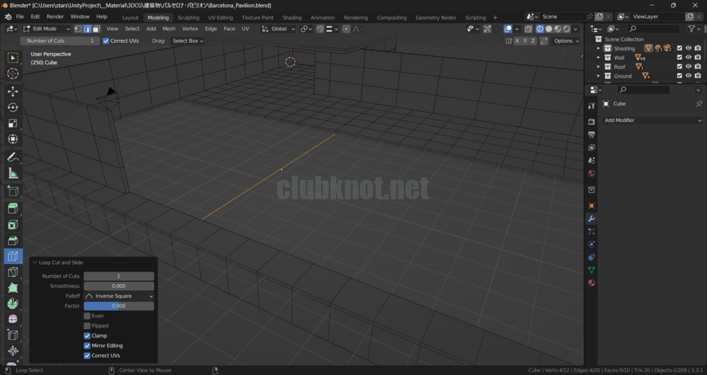 Loop Cutツールでオブジェクトの上面が正方形になるように分割する。これはやらなくても作成できるが、次の工程でポリゴンが長方形になるのが嫌なので一応。