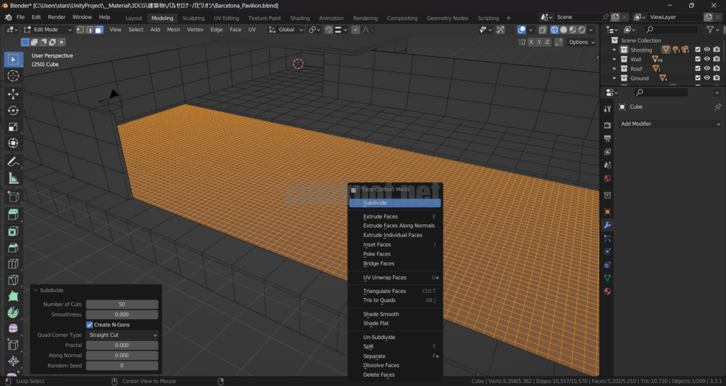 キーボードの[W](Loop Cutの終了を意図)を押し、次に[3](面選択)を押す。次に水面オブジェクトの上面を選択しマウスの右クリックメニューから「Subdivide」を選択する。左下に設定が表示されるので、「Number of Cuts」に十分な分割数の数値(30や50など大きな分割数)を入力しキーボードの[Enter]を押す。