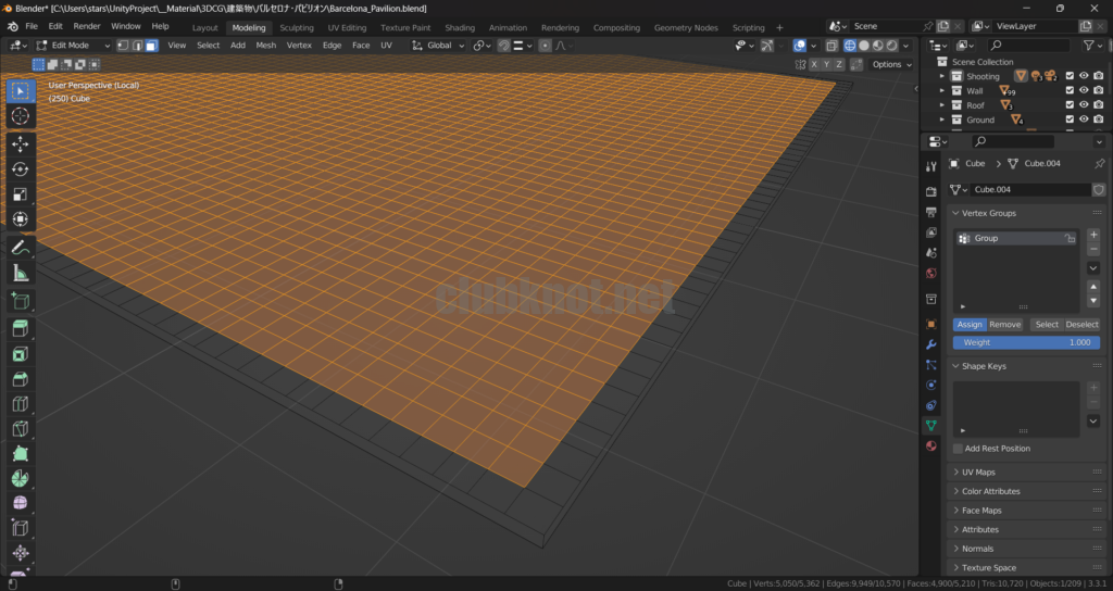 そのまま[Ctrl]+テンキーの[-]で選択範囲を小さくし、Object Data Properties(画面右の緑色のアイコンのタブ)を開く。ここのVertex Groupsで[+]ボタンをクリックしグループを追加、[Assign]ボタンをクリックする。