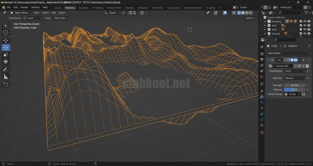 Modifier Properties(青いスパナのアイコン)を開き、「Add Modifier」リストから「Displace」を選択する。Vertex Groupのアイコンをクリックし、先ほど作成したグループ「Group」を選択する。