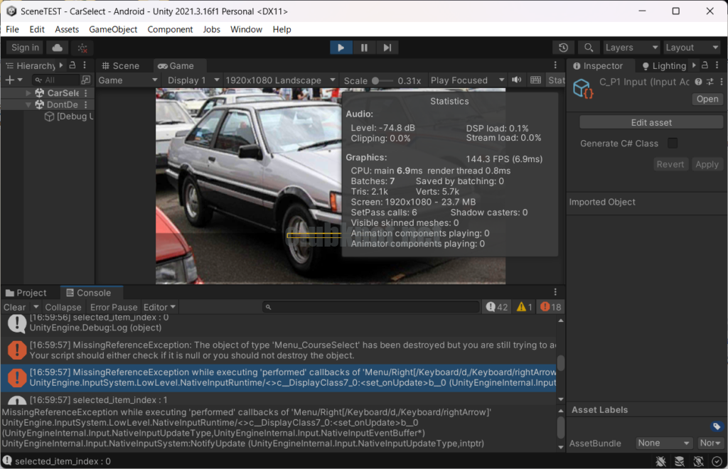 個人的に制作しているカーレースゲームでコースセレクトとカーセレクトという2個のシーンがあるのですが、コースを選択してクルマを選択する際にMissingReferenceExceptionという謎の例外が発生しました。コースセレクトシーンで設定したアクションがキーマップに残った状態で発生するので、解決方法を記述していきます。