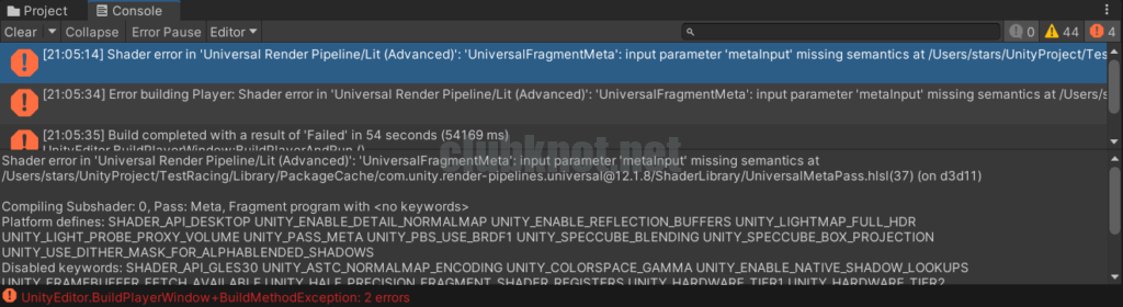 Unity 2021で進行中のプロジェクトにマテリアルをインポートすると細かいエラーが発生します。そのエラーを修正してエディタ上で遊べる様にすることは出来たのですが、ビルドを実行するとなぜか失敗してしまいます。当初はAndroid向けのビルドで試したので容量制限かと思いましたが、Windows向けビルドでも失敗するので違うようです。