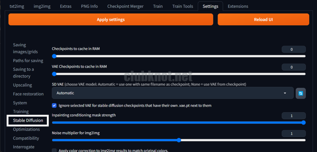 Settingsタブの左側にある「Stable Diffusion」を開きます。