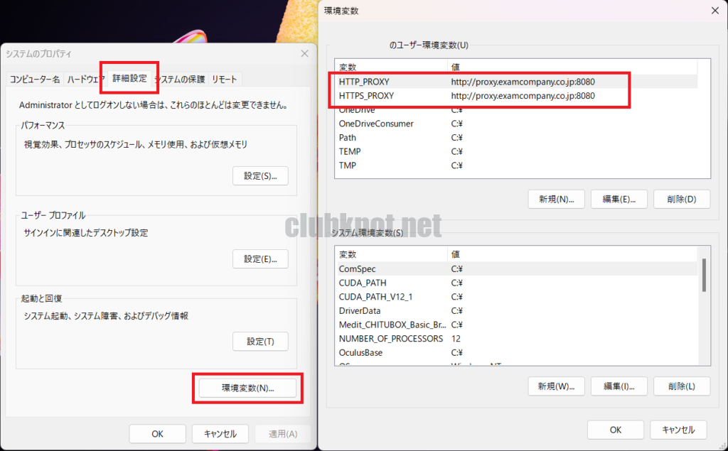 企業のネットワークであれば通常はプロキシサーバー経由でインターネットにアクセスしますので設定してみましょう。Windowsであれば、システムのプロパティ画面で設定します。Windows11の場合はタスクバーの検索窓に「環境変数」と入力すれば「システム環境変数の編集」が表示されますのでクリックします。