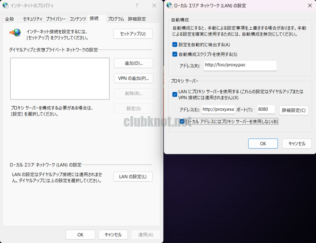 プロキシアドレスはインターネットオプションの[接続]-[LANの設定]ボタンをクリック、新しく表示されたウィンドウの「プロキシ サーバー」に記載されています。記載がなければ、貴社のネットワークでプロキシサーバーは利用していません。
